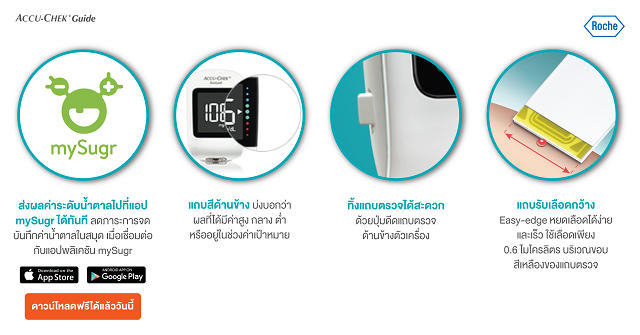 • แปลผลง่ายด้วยแถบสีด้านข้าง แสดงค่าน้ำตาลสูงกว่าค่าเป้าหมาย (สีน้ำเงิน), อยู่ในค่าเป้าหมาย (สีเขียว) หรือ ต่ำกว่าค่าเป้าหมาย (สีแดง)