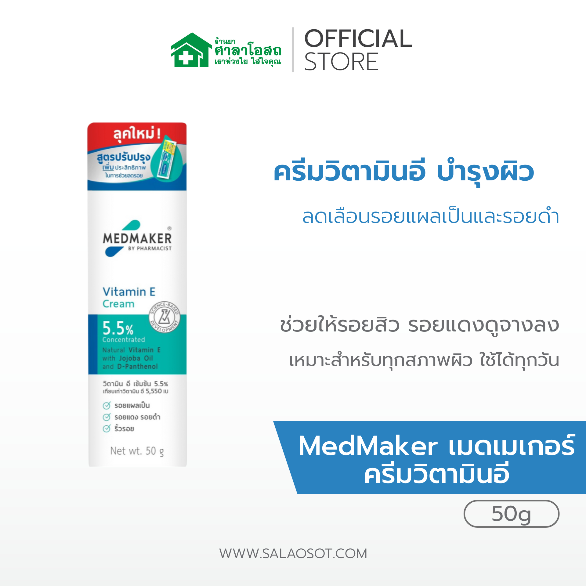 ส่วนประกอบสำคัญ - Vitamin E 5.5%, Jojoba Oil - D-Panthenol (Pro-Vitamin B5) - Sodium PCA in MEDMAKER® non-comedogenic cream base