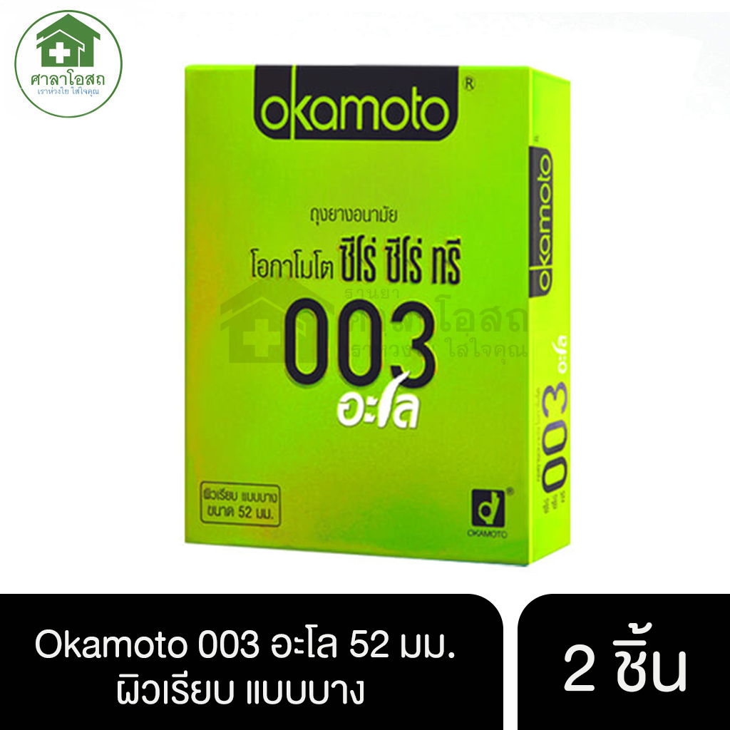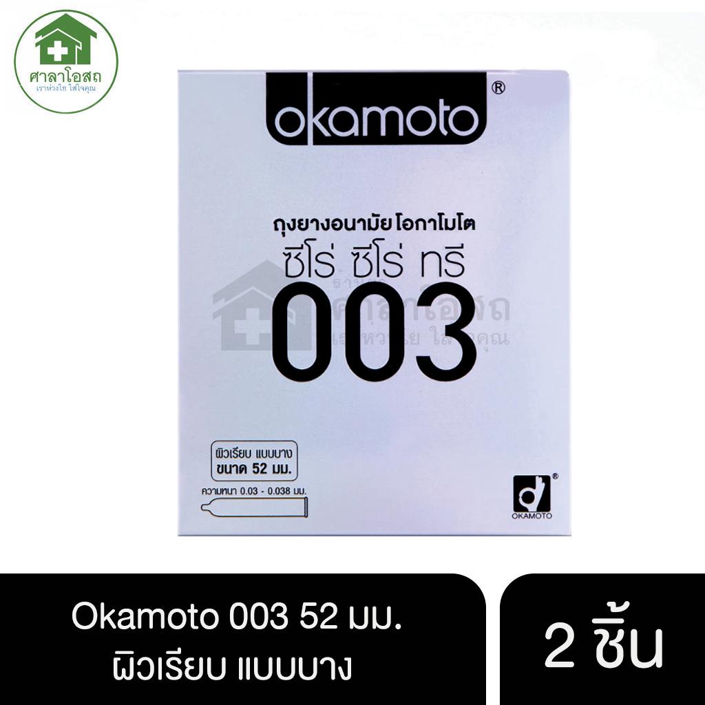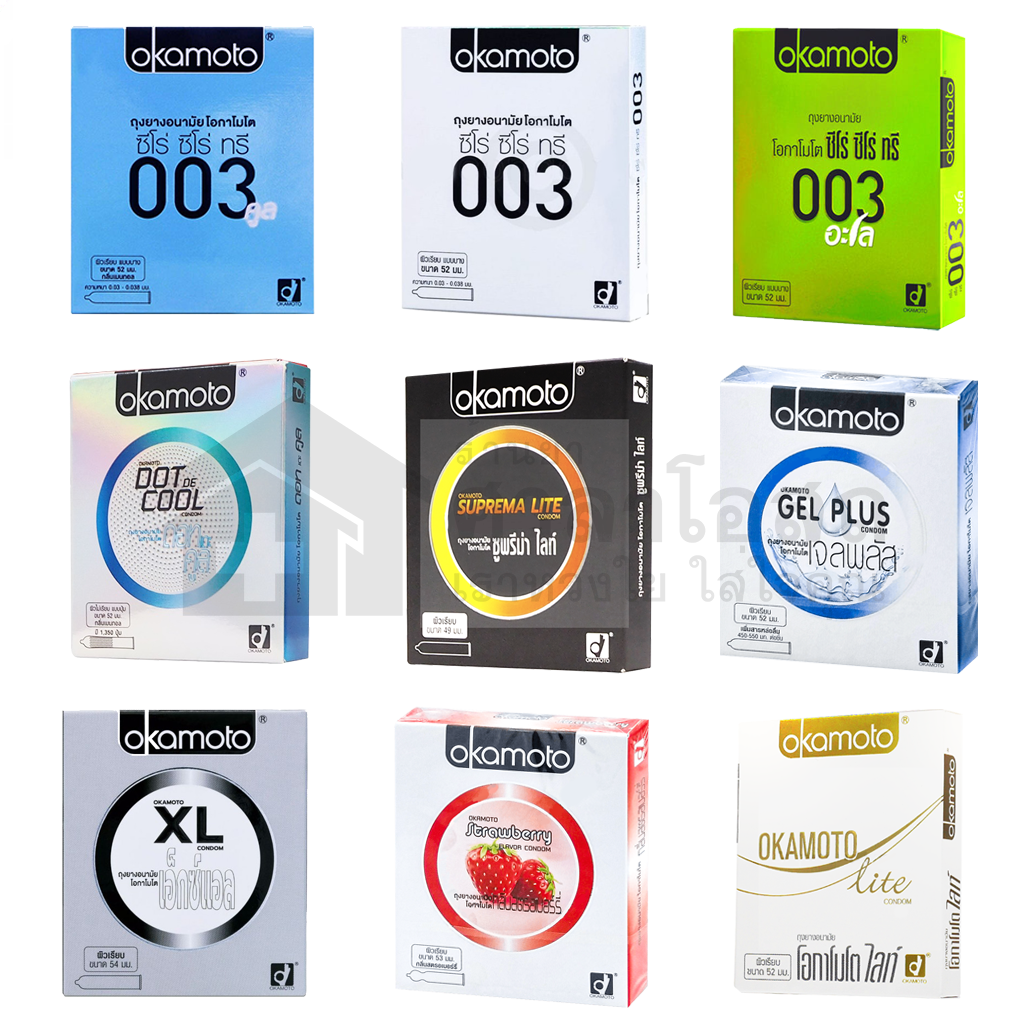 1.ถุงยางอนามัย Okamoto 003 ( โอกาโมโต ซีโร่ ซีโร่ ทรี ) บาง 0.03-0.038 mm ขนาด 52 มม. ลักษณะเด่น: บางเหมือนไม่ได้ใส่ ผิวสัมผัส: ผิวเรียบ แบบบาง สารหล่อลื่น: มีสารหล่อลื่น ขนาดรองรับ: 52 มม. ความหนา: 0.03-0.038 มม. ส่วนปลาย: ปลายกระเปาะ สี: โปร่งแสง กลิ่น/รส: ธรรมชาติ จำนวนบรรจุ: 2 ชิ้น/กล่อง ใบอนุญาตเครื่องมือแพทย์เลขที่: อย. ผ.5/2554