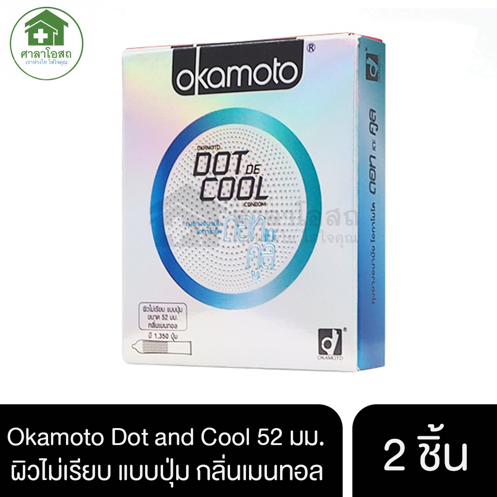 4.ถุงยางอนามัย okamoto DOT DE COOL ( โอกาโมโต ดอท เดะ คูล ) แบบปุ่ม ขนาด 52 มม. ลักษณะเด่น: ปุ่มเยอะมากที่สุด ให้ความรู้สึกเย็น สุดยอดรุ่นกระตุ้นความรู้สึกผู้หญิง ผิวสัมผัส: ผิวไม่เรียบ แบบมีปุ่ม 1,350 ปุ่ม สารหล่อลื่น: มีสารหล่อลื่น ขนาดรองรับ: 52 มม. ความหนา: 0.06 มม. ส่วนปลาย: ปลายกระเปาะ สี: โปร่งแสง เจือฟ้า กลิ่น/รส: เมนทอล จำนวนบรรจุ: 2 ชิ้น/กล่อง ใบอนุญาตเครื่องมือแพทย์เลขที: อย. ผ.36/2553