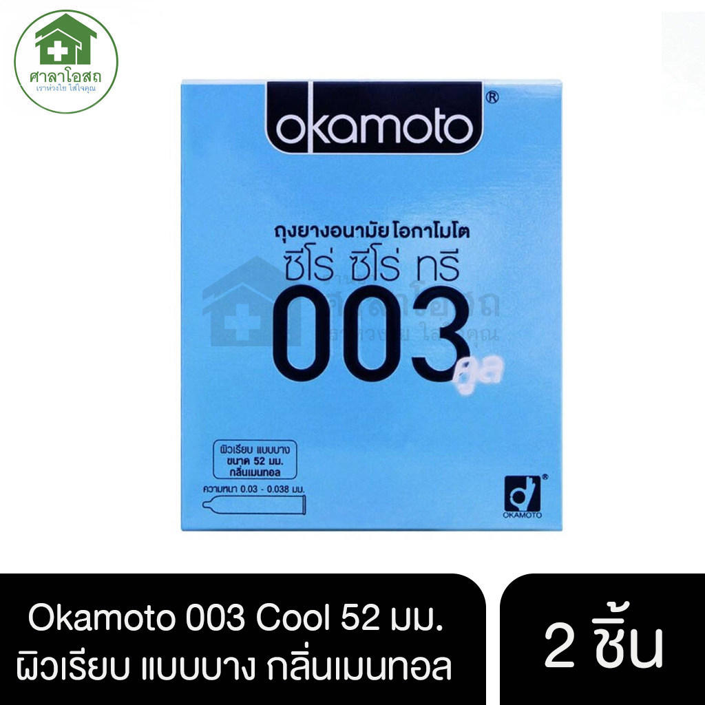3.ถุงยางอนามัย Okamoto 003 cool ( โอกาโมโต ซีโร่ ซีโร่ ทรี คูล ) บาง 0.03-0.038 mm ขนาด 52 มม. ลักษณะเด่น: บางเหมือนไม่ได้ใส่ และเย็นชะลอการหลั่ง ผิวสัมผัส: ผิวเรียบ แบบบาง สารหล่อลื่น: มีสารหล่อลื่น ขนาดรองรับ: 52 มม. ความหนา: 0.03-0.038 มม. ส่วนปลาย: ปลายกระเปาะ สี: โปร่งแสง กลิ่น/รส: เมนทอล จำนวนบรรจุ: 2 ชิ้น/กล่อง ใบอนุญาตเครื่องมือแพทย์เลขที่: อย. ผ.19/2559